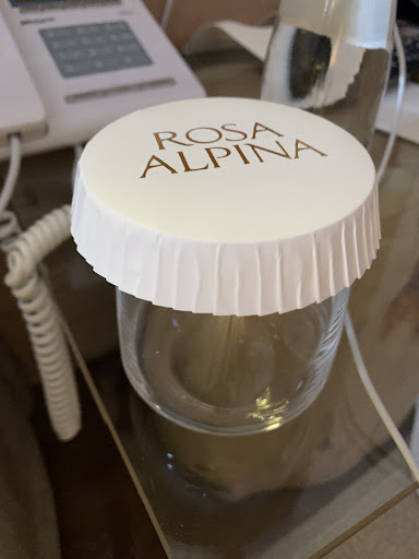 There were peculiar practices of a luxury hotel. Every glass seemed to have an odd paper skirt on its top edge pronouncing "ROSA ALPINA". Logos were everywhere, on bags, bottles, towels, napkins, plates & staff, reminding us of the hotel's name, with which we were already familiar. There was a carefully orchestrated dance of the totally unused sandals put out on a linen serviette during the turn down service, and diligently put away during the morning housekeeping service. Everything that could have a carefully folded, laundered and starched cloth napkin wrapped around its handle did have one. (PHEW) Another oddity was precipitated by my Hertz rental comparing unfavorably to the pair of Maseratis and an Aston Martin parked in front.