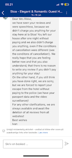 Yes, there is a first time for everything, and this was also the first time I was threatened with the police to remove a review. If you want to have a real dialogue, we can do it through booking.com, where this trip was booked, as this does not lead to anything...