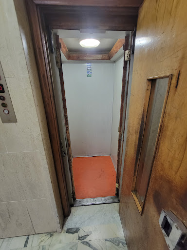 We proceeded through the lobby to a small, dilapidated, and very out of date elevator.