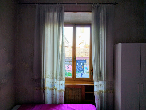 This is not a fancy hotel or a fancy neighborhood, but the room was large by European standards, clean, and comfortable, with air conditioning, a mini-fridge, and two big comfy chairs. Don't let the low, low price scare you away: it's not a sketchy place at all. We did have a little bit of trouble with the building's old plumbing, but were otherwise so pleased that we didn't really mind. Also, even though it is right near the train station, we barely noticed the sound of the trains at all-- the building must be very sound-proof. An excellent budget-friendly choice. Walkable to the station and to many tourist sites. The hotel is situated on the upper floor of an apartment building; when you arrive, you have to ring the bell, and the owner will buzz you in. The building is quite nice on the inside.