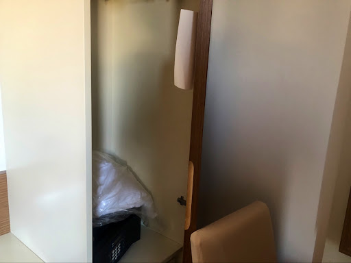 Inside the room the cupboard door was impossible to open completely without moving the chair. And when you moved the chair you could not reach the cupboard. And once you did that, I could not come out without hitting my feet and shins either to bed or chair.