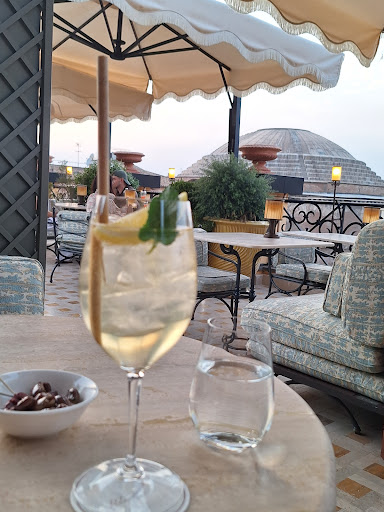 We picked out one of the cheapest, happily a Shiraz, maybe 35 Euros. Heat lamps every once in awhile wafted some precious warmth at us where we sat on the edge of the roof. They gave us marcona almonds, the nicest bowl of nuts we received in Rome. I don't remember if there were olives. We drank wine, pondering the fascinating rooftops of the baroque city, the intriguingly bland facades of gothic Sopra Minerva, and the ancient, massive wonder of the flanks of The Pantheon.
