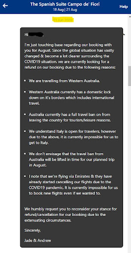 Read moreWe booked flights (Perth, Western Australia) at the start of Jan 2020 (pre-COVID official pandemic announcement). We went through Booking.com and booked a non-refundable reservation on 25/01/2020 for our trip during August (Europe trip - stay in Rome mid-August).
