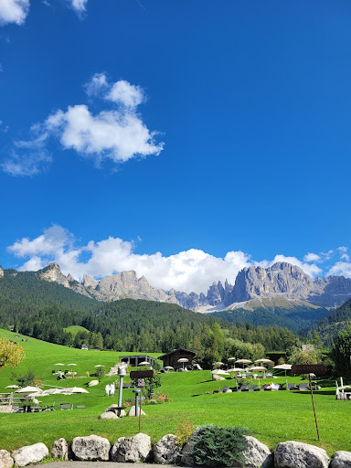 Most spectacular location. Just sit and watch the Dolomites in all shades of light. Daily offer of 1-2 hikes per day with professional Bergführern as well as climbing options. Sometimes the groups do get a bit large as anybody can join (20+ people are too many to my taste). Watch out as classifications of hikes done by the hotel and by the Bergführer may differ! My intermediate hike definitely was advanced in parts. It is a nice idea to watch the photos done during the hike in the evening at the bar. You can also get them on a stick to take home. The great location of the hotel makes it possible to do lots of different hikes as the bus stop is conveniently located just across the hotel so you don't need to drive at all. A one week bus pass is included. As the hotel is right next to the road leading up the mountain, the seats outside as well as some rooms will not be as quite and remote as you may want them to be. Nice inside/outside pool and small natural lake and three saunas, one steam bath. I did like the stylish and convenient Kneipp basins leading out of the spa area. Two big rooms to relax and the big lawn with sun beds and fantastic views. It is said that the pool/spa area will be enlarged this winter. I did not have the need for that. They even have a small indoor climbing wall. The food is nice but portions are very small (I didn't mind as this helped me to manage all four courses). If your waiter doesn't tell you (like mine): you can always have seconds and there are open wines so you don't need to get a bottle. Also: the water automatically served at the table is not for free. Prices for some beverages are steep (€6.20 for a large apple spritz is ridiculous and higher then even in remote mountain huts). Very nice breakfast buffet with lots of fresh fruit, cereals, local breads, great cold cuts, various egg dishes and more. Free afternoon snack buffet with one soup option and pastries. Staff is very nice. Rooms are stylish and clean. Some tiny things could be improved: state the number of reception in the rooms (dependence Bergheim), change the curtain design in the Bergheim rooms. The rooms are so nicely done but the curtains must be a relict from other earlier times. Great design of the bathroom but it is impossible to shower without the toilet and half the wash room getting wet. Last comment on prices: this is a fab place to be but with lots to offer but prices are steep, especially for the region. No kids prices unless two adults paying. Additional charges for stays shorter then 5 days. If you come by train: the hotel can easily and directly be reached by bus from Bozen...