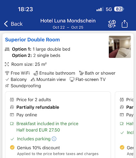 Unfortunately, this was not the only issue. It seems that the hotel’s management has become increasingly disorganized. At check-in, we also experienced an unpleasant situation. When booking, we saw on Booking.com that half-board could be added for only €27.5 per night, which matched our past experience, where we could reserve dinners at a discounted rate upon arrival. However, this time we were told that dinner cost €55 per person per night. We showed the staff the Booking page and explained that this was misleading advertising, but their only reply was that they agreed it was misleading, yet they had “no idea why.” Moreover, one young lady at the front desk showed clear impatience when we tried to discuss the issue, repeatedly asking why we didn’t book directly through their website instead of helping us resolve the problem. I believe it is entirely my right to choose which platform I use to make my reservation.