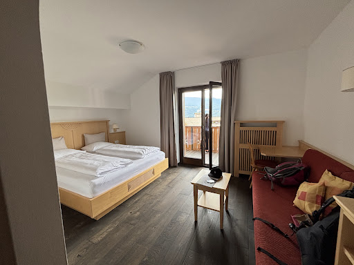 We participated in a music festival for 3 weeks in July (Semper Music International Festival) and had the pleasure of staying here. Daniela is the main host of what is a charming and warm family operation. She is one of the most cheerful people we have ever met! ||The rooms are rustic-simple and spotless. One thing I've always appreciated is having places to put things. There was so much of that I didn't know what to do :)----shelves, drawers, cabinets, closet.....all of which make a smallish room not feel small. ||We were on a corner so enjoyed two lovely views, and every room has a very nice balcony with a table and chairs. The view is great from any room. ||The breakfast is stupendous and one of the best---if not the best---of comparable lodges. We had first rate espresso drinks, a large choice of wonderful fresh bread and sometimes croissants or a coffee-cake, fruit and mixed fruit (the fruit in that region is to die for), yogurts, quark (a European lower fat cheese resembling ricotta or pureed cottage cheese), a large selection of home-made jams and preserves, a large selection of cold cereals and accoutrements, a good selection of cheeses, etc. They will prepare you an omelette or boiled eggs as well. It's easy to get through half the day on that breakfast. ||Be aware that Daniela does not speak a lot of English. If you know a little German or Italian you'll thrive in the S. Tirol. I had a hilarious time communicating with Daniela by speaking to her in Spanish and mostly understanding her responses in Italian. (I know a few main words in Italian which I substituted as I could--which helped). ||I highly recommend Hubertus. And if you like strudel, be sure to go to the bakery that's at the main bus stop in town, on the same side as the bank. They have a fabulous apricot strudel as well as a great cheese one. (You also can't go wrong with apple anywhere in the area, because they are literally hanging off the trees everywhere.)||I should add that there is a lounge/bar room with a refrigerated...