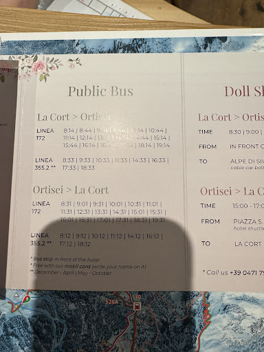 Read moreWe recently stayed at La Cort and genuinely cannot praise it highly enough! My favourite hotel I have ever stayed in. ||Location - La Cort sits just above Ortisei, giving it really beautiful views from the rooms, restaurant and spa. Itâs only ten minutes by car into town, but you could easily stay here without a car. The bus stops right outside the door and you get tickets allowing you to use it for free when you check in. We chose to get the bus rather than drive when getting the cable car to SecĂ«da and Alpe Di Siusi as it was so handy and left in time to catch the first cable car! The bus also runs in the evening so getting into town is not an issue at any time of day. ||Food - the food here is INCREDIBLE. Delicious breakfast served from 7.30 all the way through to 11am. The pastries and pancakes are made fresh and the coffee is delicious. Linner which runs from 4-7 is this magical combination of hearty hot food like salmon and potatoes or pasta and soup, cold meats and cheeses, tonnes of tasty salads AND a range of desserts. Everything is so delicious and linner is not any extra charge. You will not need dinner! Itâs also at the perfect time if you have been out all day hiking. There is also an honesty bar / snack shack after hours, so if you arrived at any time of night you could still get a snack and a drink. The food was the best I have ever had in any hotel. ||Spa - the spa is small but perfect. It also stays open till 9pm which is so great when youâve hiked all day then feasted at linner - you just lay there and relax till bedtime! The infinity pool and sauna have panoramic views of the surrounding mountains making it so peaceful. There is also cold water, hot water and a range of juices and hot teas for free. If you fancy an alcoholic drink you can purchase these too. ||The hotel owners are friendly and helpful, and the whole place has a really homely and friendly feel to it, while also managing to feel contemporary and cool. ||Book it, itâs the best...