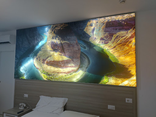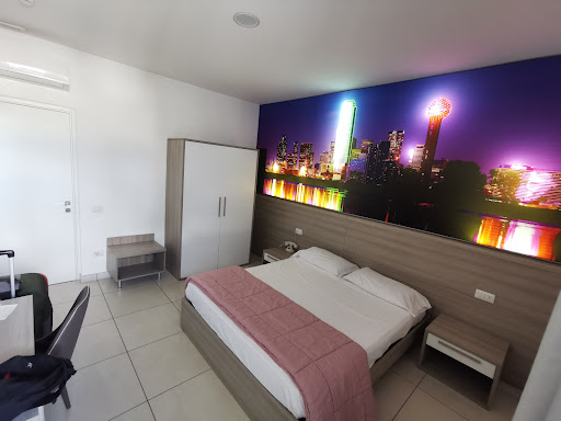 Read moreNous avions choisi cet hôtel du fait d'un prix attractif et de la possibilité d'arrivée tardive. Et nous n'avons pas été déçus ! L'hôtel est facile à trouver comme se situant juste à la sortie de la voie rapide arrivant à Scafati depuis l'arrière du Vésuve. Belle vue sur ce dernier depuis le parking (privé) et certaines chambres. Le personnel s'est montré bien sympathique malgré l'obstacle de la langue (français non parlé) et a su tout au long de notre séjour gentiment s'adapter à nos impératifs horaires pourtant parfois très matinaux. Le petit déjeuner se prend dans une partie privative du bar América juste à côté de l'hôtel et a satisfait toute la famille (un jus de fruit, une boisson chaude et un croissant fourré principalement). Les chambres sont spacieuses, bien équipées et décorées dans un style moderne et original orienté US (les enfants ont particulièrement aimé le grand tableau lumineux représentant la ville donnant le nom à la chambre). La couleur blanche domine dans tout hôtel (très récent je pense) qui est très propre et bien tenu. Si les environs de l'hôtel sont quelconques (début de campagne autour de Scafati), les nuits y sont calmes. Depuis l'hôtel on peut accéder rapidement à Napoli par la voie rapide mais également après avoir traversé 5 à 10 minutes Scafati (sauf circulation) via l'autoroute littorale. L'hôtel se situe à 10 minutes environ en voiture des ruines de Pompéi. Si nous revenons du côté de Naples, nous orienterons à nouveau notre choix vers...