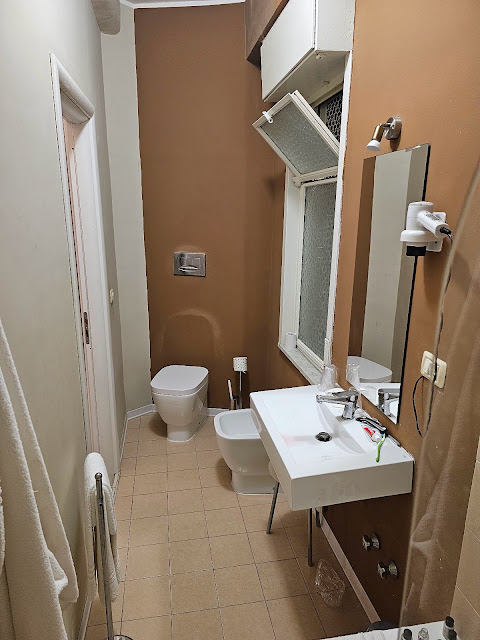 Now to the building itself! A poorly maintained relic and showing all the signs of neglect. Crumbling plasterboard walls, questionable wiring, rubbed off paint... How they managed to muster up 4 stars is beyond comprehension. Perhaps by exploiting the gorgeous Italian nature? I dare say it's a 2-star motel at best. And don't even get me started on the so-called "facilities." No pool, no spa, no private beach, no entertainment, not even a working AC. Everything else that is there needs extra payment, like their parking (10€/day), which requires a masterclass in off-road driving to get there. Oh, the regular noise of passing trains is free!