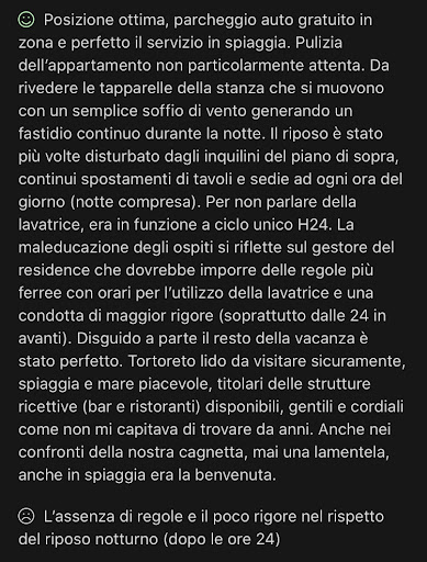È la seconda volta che io e la mia famiglia veniamo in questo residence,il soggiorno è stato veramente piacevole.l'appartamento era al secondo piano,un bilocale luminoso e spazioso,con 2 terrazzi,una lavatrice, una lavastoviglie e 2 condizionatori.La posizione del residence è ottima anche per quanto riguarda i servizi,a pochi passi dal lungo mare e dallo stabilimento balneare.Un grazie a Doriana una persona fantastica,gentile, sorridente sempre disponibile se si presenta un problema lei trova sempre una soluzione...le signore delle pulizie gentili e cortesi. Super consigliato per tutto, ritorneremo...