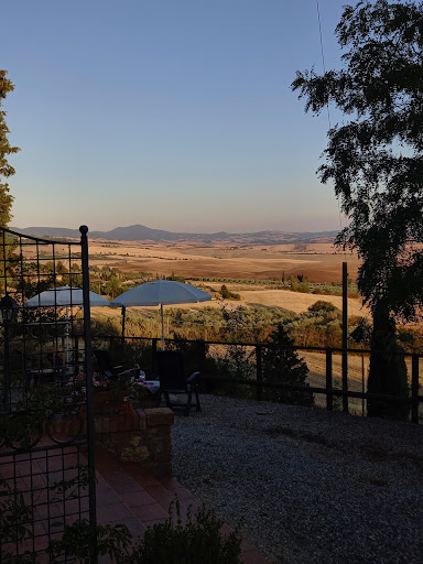 It must have been good fortune smiling on us when we found Maresco and Lucia at Colombaiolo. Call it luck, serendipity, or just following a hunch. We had intended to stay several nights in a nearby town but left after one night determined we could find something more comfortable. We did.||||We stopped in Pienza for lunch and a walk, did a little internet searching, then asked at a tourist info spot about this agriturismo that had pretty good reviews. They directed us around the old town, outside the walls and behind, then a sharp left heading toward the Val dâOrcia. We found the small sign and rang at the gate. Maresco let us in then went to find Lucia when he found us speaking English. Yes, she had a room and when we saw it we promptly accepted her terms.||||The spacious room, perhaps the one called âSummer,â boasts an entry with table and desk and a curtained arch opening into the spacious bedroom. A window allowed the morning light. A large wardrobe provided hanging space. A small refrigerator held beverages for sale. A safe protected our limited valuables. There was a WiFi router in the room with two servers providing good service. And the bathroom, ⌠Large! There was a large tub for soaking complete with shower, so large a shower curtain was not needed. ||||Outside, the entire Val dâOrcia opened up below us. What a view! We enjoyed walking about morning and evening taking pictures and soaking up the atmosphere. We heard that there had been no rain to speak of for the past year. Indeed there was no water running in the stream beds. The fields all around were brown except for the golden vineyards and the silver olive trees. Nevertheless, farmers were deep plowing and cultivating in preparation for winter crops. And there was even an afternoon shower while we were there that seemed to change the colors of the valley overnight. ||||Lucia provides a well served breakfast of bread, pastries, cheese, yogurt, fruit, ⌠more than I can remember. Everything is attractively laid out. She asked the night before how we wanted coffee and had it ready in thermos bottles when we arrived. On the first morning we asked for more coffee; the next morning there was a larger thermos. Lucia is attentive. ||||We marveled at the contrast of how new the place appeared while simultaneously seeming old and well established. When pressed, Lucia admitted that she repaints the interiors every year. I think we can assume that there is a good deal of detailed cleaning that goes on between paintings. She runs an immaculate B & B. ||||I didnât get details on how much of the surrounding farm land is theirs. Close by livestock includes Peacocks, chickens, ducks, and a horse. There is a barn with several tractors and large equipment, an extensive stockpile of hay sufficient for more livestock than I could see, and surrounding areas of vineyards and olive orchards. When we go back, we will have to learn more about the farming operation. ||||Colombaiolo is conveniently located just five minutes or less by car from Pienza where we went for evening meals. Itâs less than 30 minutes to Montepulciano, a trifle further to Montalcino. Both can be accessed by skipping the main roads and driving through the valley. Along the way, a stop in the village of Montichiello was a highlight. ||||Colombaiolo was a good find for us and a great place to enjoy that...