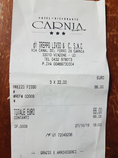 My first experience was in 2012, when on my freshly bought motorcycle I reached here after 12 hour travelling. I was quite nervous, because it was hard to find a 24 hour open hotel. Then came the divine spark, our saviour, the Hotel Carnia sign with 3m high letters. Silent (hills) mountains, only the morning rain causes some noise. Excellent restaurant and bar - not sure, but maybe there had been Enzo Ferrari on one day at the restaurant as the photos said on the wall on the restaurant-corridor. Motorcycle can be placed into a closed garage, next to the bicycles of the employees - absolutely safe place. Nice story - we asked the barmaid to make two coctails for us. I tried to explain, that we see a coctail on big billborads in dark reddish colour - it must had been Negrito according to her - and an other coctail. After some time, she appeared with her manager next to our table, apologizing, that they have no fresh apricot for that other coctail. I was so surprised, that they do not even tried to use juice instead, and agreed to have the second coctail to changed to Negrito as well. That honesty deserved some 20% tip...