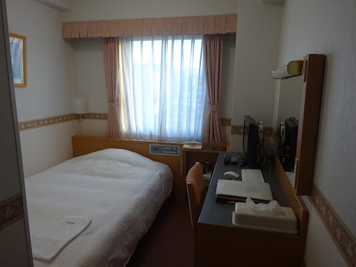 This hotel is very close to Aizu-Wakamatsu station; the area is shabby, the building unremarkable to say the least, and to get to the town centre, delightful Nanoka-machi St., or the beautiful tourist sites like the castle or Oyakuen garden, you need to use the small tourist buses that start at the station and circulate (clockwise and anti-clockwise) all day, or the plentiful taxis. However, we were pleasantly surprised by the hotel. Our room was spacious (for a Japanese business hotel), plain but very clean, with a view of distant mountains (we hadn't asked for an upper floor room with a view, but it would be worth doing so, as other rooms would face neighbouring buildings). The services of the hotel are geared to business travellers: newspaper on check-in, good quality bath items, laundromat - and a Windows pc in the room, connected to the Internet by LAN cable, which is also free to use for your own computer. Breakfast, in a small room off the lobby, is an excellent buffet, Japanese and Western, everything notably fresh. Front desk staff are pleasant and efficient, the ladies who take care of breakfast cheerful and kind. We expected this hotel to be just a cheap place to sleep after a long trip, but ended up feeling comfortable there and...