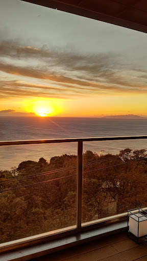 Read more公共交通機関を利用するならJR熱海の近くの、JR網代駅からタクシーで10分ほどで着きます。駅前にタクシー乗り場があり、その中で第一タクシーを利用すれば宿のチケットが利用できてタクシー代金はかかりません。第一タクシー以外はダメです。自家用車では、海から直ぐ山になる伊豆の地形を知る人なら納得の海沿いの国道135号線を網代を抜けて南下していくと左側に入っていく山道の入り口に「さんが」さんの看板が漢字で出ている道があります。そこを登っていくと道がY字になるので右側の道を上がっていくと着くことが出来ます。結構小高い所まで上がってくるので見晴らしが良いです。部屋は海に面しており正面に初島が、島の建物の窓が分かりそうに感じる位に近くに見えますが実際には人の動きを見ることは難しいです。夜は島の灯台や建物の灯りも見えて綺麗です。明け方には島の手前に漁をする船を見ることが出来ます。部屋付の露天風呂の温泉はナトリウム泉で塩味が強いです。ポカポカ暖まります。また帰宅後にゴワゴワしていた肘がスベスベになっていることに気づきました。肌に良さそうです。こちらの食事はとても繊細で味付けも見事なので楽しみの1つです。夕食は部屋で懐石料理でした。器の美しさと相まって美味しく楽しい時間を過ごすことが出来ました。日本酒をいただきましたが酒器にもこだわりを感じさせられました。朝食は宿泊した部屋専用の食事室でいただきました。朝日の入る明るい部屋での食事は気分も上がります。部屋の中の冷蔵庫にはアルコールやソフトドリンクがフリードリンクになっていて、飲んだ後もこまめに補充されていてありがたかったです。女将や部屋係の仲居さんの心遣いを感じながら海を眺め静かな時間の流れの中で贅沢な思いのできる宿です。リピーター兼ファンつまり...