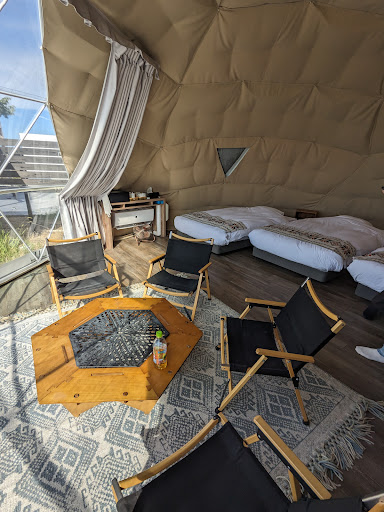 9月上旬にグランピング一泊しました。他の口コミにもありますが、昼間はグランピング室内はあまり冷房が効かないので熱かったです。しかし9月でしたので外のほうが涼しく、日陰でリクライニング椅子に座って涼んでいました。施設のお兄さんに日の入りの時間を教えてもらえて 、リクライニング椅子に座りながらプライベートビーチを眺めながら日の入りをゆったりと見てました!これは最高だった…。夜は外も涼しくなって、グランピング室内もクーラーが効いてきて涼しく快適になりました。9月上旬だとまだ昼間は暑いので夕方からチェックインするのもいいかも。秋の涼しい時や冬・春がおすすめです。まぁキャンプの少し豪華バージョンがグランピングだと思ってるので、キャンプを楽しむんだ!という思いで行ってほしいです、私は楽しかったです!ただ、もう少しクーラーが通常通り効けば、夏も行きたいと思います(笑)お部屋はドーム型のグランピング施設を4人で借りました。冷蔵庫(サービスで2リットルくらいの水が入ってた!)・金庫・電気ケトル(サービスでコーヒーパック有り)・外に出る用のクロックスがあった。外に出る用のクロックスは底が薄いので砂利道を歩くと足つぼで痛きもちいい(笑)シャワーとトイレは外にあります。シャワーは簡易的なものなので、私はパルシェの湯(車で10分くらいの温泉、入浴料730円)まで入りに行きました。食事は食材持ち込み型のバーベキューをしました。BBQはカセットコンロと鉄板で宿泊費とは別に2000円で借りられます。調理バサミ・トング・割り箸・カセットコンロ用ガス・塩コショウ・焼肉タレはサービスで置かれていて、とても親切でした!ゴミ捨て場もあったので良かったです。消灯は22時と聞いていましたが、隣の区画の家族?がうるさくて3時くらいまで大きな声が聞こえてました…。まぁ私は寝れましたが、他の人は寝れなかった人もいて、残念でした。消灯時間をもう少し遅くしたら守ってくれるのかな?