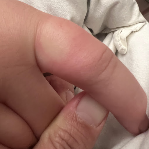 次の日、気分良く起きたら子供の指に何かの虫にさされ指輪がとてもはれてました💦 今の写真は、2日目のことで何に刺されたと思いますか?なかなか、落ち着かないです。