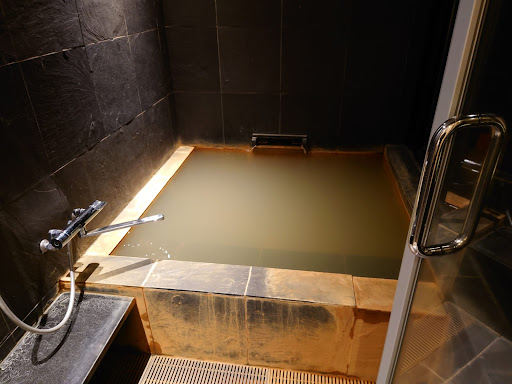 半露天風呂は、中庭が見えるような感じになっていて、熱々の湯船に浸かりながら夜風の涼しさも味わえます。中庭に繋がる窓も、網戸がついていますので夏でも虫など入ってこないかと思います。 温泉掛け流しで、ずっとちょろちょろ出ているので温度が下がるわけでもなく、元の温度は43℃くらいに感じたので熱めです。お水を足して入りました。 ホームページを見たところ、皮膚病などに効く温泉のようですが、お風呂あがりの乾燥が酷く感じました。私は乾燥肌ですので結構カサカサしました……アトピーの方などはつらいかもしれません。保湿剤を持っていくことをおすすめします。