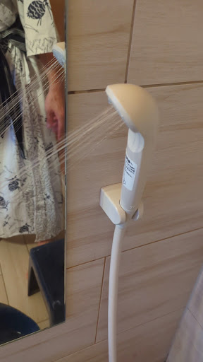The shower head in my room is ridiculous. It covers a small area but with high pressure which means it is quite painful but takes low to shower. See video. Thankfully, they have free onsen with shower so we ended up always going there to shower.