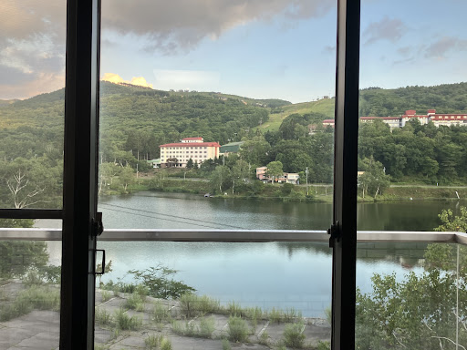 調理室のガラスはひび割れたまま。 大浴場のガラスはひび割れたまま。 南館へと続く廊下から、南館と思われるエリアが見えるものの、暗闇のなか「非常灯」だけが灯っている。 大浴場へ向かう階段の電気が付いておらず真っ暗。別の時間に訪れてみたときには、付いてはいたものの、電灯の寿命が近いのか、付いたり消えたりを不気味に繰り返していた。