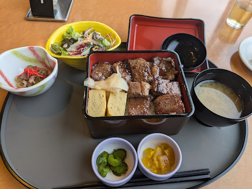 Lunch includes a sweets buffet and drinks bar, which was a pretty good deal. I had the steak box, which came on a tray holding a fancy bento box containing a layer of rice topped with cut pieces of steak, and little bowls with an appetizer, salad, Japanese pickles, and miso soup. The meat was really tender and flavorful. The drinks bar offered coffee, latte, tea, and soft drinks. A variety of cakes were offered on the dessert table. Lunch was really good and I even got a discount coupon for their day use onsen.
