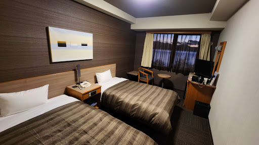 Read moreWhen reviewing hotels it is essential to take price and location into consideration. There are numerous hotels in Tokyo CBD catering for every taste and price range but significantly fewer in Kawaguchiko. Supply and demand also makes the former a more competitive hotel location. ||Having said all that, last night we stayed in a shoebox room in the Shinjuku Washington Hotel and our current room today in the Route Inn in Kawaguchiko is significantly better. ||The modular bathrooms are virtually identical, bath cum shower and the obligatory heated toilet, in a very small but functional space. The room, however, is appreciably larger with two double beds and a couple of chairs and a small table. The main negative is the lack of any facilities for your luggage. We ended up using one of the beds as the luggage rack and slept in the second bed., not ideal but reasonably comfortable. There is a hanging facility for your clothes in the small corridor but it is hardly worth the effort of unpacking if you are only staying for one night. Most rooms have a scenic window view of Lake Kawaguchiko and possibly Mount Fuji if the cloud Gods favour you. ||The hotel is an Olsen (hot spring water bath) hotel so there is a male and female bath on the 6th floor overlooking the lake. A recommended and pleasurable experience.||The hotel provides a buffet dinner in a canteen style restaurant, so no atmosphere. There was a wide range of food choices but all cold, and probably best missed, in retrospect. Y1500 for all you can drink beer, wine and spirits in 2 hours option to numb the taste buds, if you regard it as more convenient than finding a better dining option elsewhere in the village.||Unable to comment on price as we were part of a tour group but if the price is right, the Route Inn is acceptable, but give the buffet dinner the...
