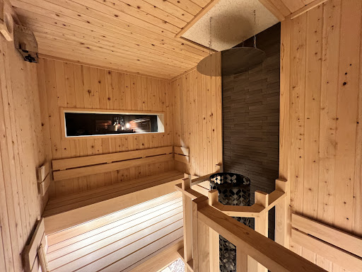 脱衣所は6畳余りのスペースがあり、カゴが4つ。薄暗さが良い暖灯でいい感じの塩梅です。そこからサ室の横に長方形の窓が隣接していて中が見れます。 サ室は3畳くらいの変形コの字2段で、MAX5人で3~4人がいい感じでしょうか。まだ新しいので清潔感がとてもあり、木の香り満喫です。室温は94℃前後ですね。 15分計砂時計が装備されていました。マット、タオルなどはありません。 フィンランドミサ社のサウナストーブでストーンにロウリュウするとアロマの香りが充満してともいい感じ。一人アウフグースで完全満喫です! 横になるにはちょっと狭いですが、せっかく独り占めでいるので、上段に仰向けに寝てみました。贅沢ですね~。