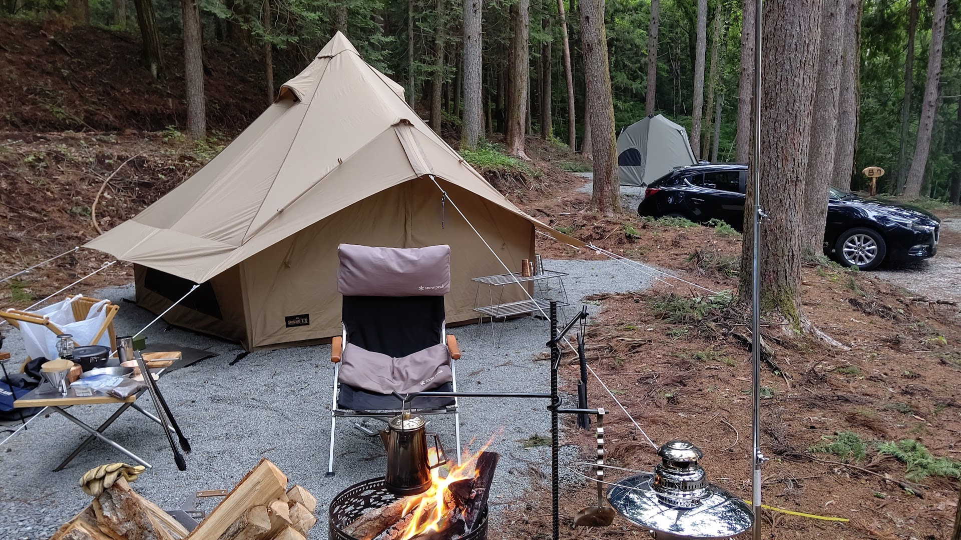 オーナーさんが言ってた通り 後の山と、背の高い木に囲まれているので キャンプ場内は風が穏やか 近所のスーパーの駐車場では暴風だったのに キャンプ場に戻ると風が穏やかでビックリしました。