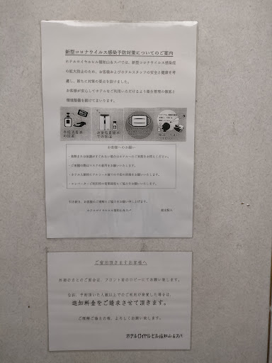 It was a convenient location right next to the Fukuchiyama interchange. There is a convenience store in front of you, which is convenient for shopping. The building feels old, but it is large, spacious and beautiful. The hot spring facility was very good. Especially the open-air bath and the sauna were big and spacious and comfortable. Breakfast was a Japanese set meal, not a buffet, due to the influence of the coronavirus. Although it is Japanese food, it was good to be able to drink coffee after meals. Despite being a hotel with a good hot spring, it was very vacant. I think it's a recommended...