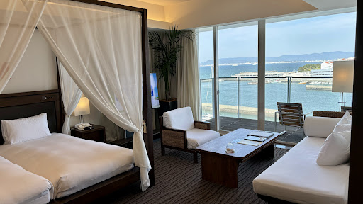 Secluded high end hotel by the Fukuoka pier away from the city which most guests arrived by driving their own rental car. Both service and hotel premise are outstanding. They got well trained service oriented staff helped guests with sending their luggages to their room, and showed guests their room and made guests feel like a vip. They also got complimentary free flow of alcohols and snacks serving from 3-5pm and 8-11pm (with ramen serving at 10pm) at the lobby cafe which we appreciated and also enjoyed a lot. We attended these complimentary drink and snack outings mostly by ourselves alone without other guests.. However, there is some room to improve in terms of cleanliness in housekeeping as I found a piece of hair in the bed and some food on floor along with a receipt left by the previous guest which is not acceptable for this sort of high end hotel. I also requested for a room away from the noise and given that they only got 10-15 parties checked in last night with 5 floors, staff has assigned us to a room next to another party and we could hear the couple arguing at night when we opened the balcony door. Having said that we still found this hotel lovely as we appreciate the warmness of all the welcoming staff from the check in, the bonfire event from 8-10pm and all the lobby cafe staff throughout the whole stay. The room, the beds and amenities are all excellent.. I will recommend this hotel to friends in off peak seasons esp in a good...