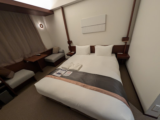 Read moreWe stayed at this business hotel for several days and had a mixed experience, perhaps due to our expectations. We originally booked a double room. After stepping into the space -- a third floor room with stained carpet and couch overlooking a parking lot with one side of the bed next to a wall and the other with less than half a meter of space around it -- asked if there were other options. We were then shown to a much larger double room on the top floor with a great view of the cityscape, a washer/dryer combo, great shower and soaking tub bathroom with a separate space for the sink and modern Japanese-style toilet. This room was double the price, but as we needed more space for this stay -- especially a larger desk -- we shifted and don't regret that. The room had a mini-fridge, kettle, and a few cups and glasses, which was helpful for a longer-term stay. There is no housekeeping in the hotel unless you pay an additional approximately $12 USD per day; for stays longer than 5 days they will do it automatically. The issue of cleanliness comes up when seeing how many stains were on the carpet and couch. (Yes, one can certainly throw the towels in the washing machine but decoding the machine does take time!) Staff were at times overwhelmed by having English-speaking customers, however all were sufficiently intrepid to use translation apps when there was a need for clarification; after a few tries, they were able to assist with forwarding our luggage to the next destination and timely assistance with a restaurant reservation. On the (very) plus side, the location of the hotel is fantastic, with easy access to great restaurants, coffee, bus routes, the riverside, and everything else Fukuoka has to offer. We might still opt to stay here on another visit, but would bring a) less expectations, and b)...