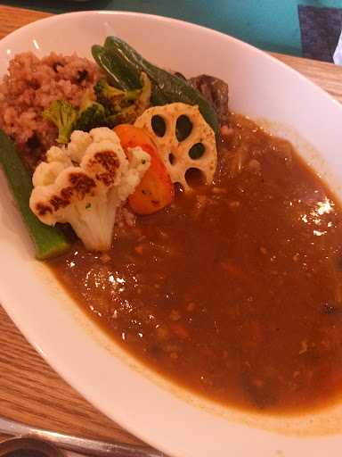 無農薬野菜や漢方食材など28種を煮込まれた、通称薬膳カレー。ご飯は白米か感謝酵素玄米のどちらかを選べるので玄米を選ぶ。焼き野菜(大ぶりのレンコン、カリフラワー、ピーマン、人参)が添えられている。煮込まれたカレーは油分少なく感じ、さらりとしている。スパイスカレーに似た質感。カレーは辛くない、マイルドなお味。美味しい。添えられたキャロットスープのほのかな塩味が体に染み渡る。