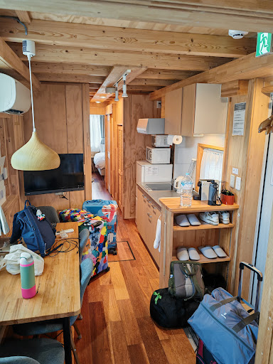 Read moreCute, cosy, comfortable, clean , modern, pine wood interior throughout, what looks like a refurbished container. 2 single beds at one end and 2 futon beds on tatami on the other end. The kitchenette sits in the middle of the cabin, equipped with short fridge, microwave, induction stove, pans, plates, utensils. There is a dining table, 2 chairs and a bench. Nice to find a washing machine but no dryer. One shower room with sink and a separate toilet. There are 4 bins for separating trash. There is only one air conditioner in the middle of the cabin so the room sliding doors have to be left open to allow air flow. Only issue was a hair pile and small trash left on top of short fridge. Easy free onsite parking. Had a very comfortable stay in this cabin, and could stay forever in...