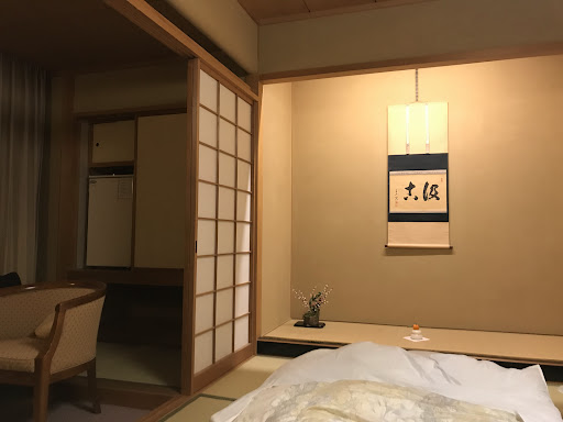 Small Ryokan - only 16 rooms - near the river in Gero. Itโs not as grand as some of the other places in the area, but itโs clean, the staff are super friendly (they even speak a bit of English if you get stuck), and both the indoor and outdoor baths are great for relaxing - my tip is to wait until after 9 (the baths are open 24/7), as youโll most likely have the bath to yourself. You can also book a 40 minute slot in the private bath. Dinner (small portions but about 10 courses), includes the local speciality Hida beef, along with sashimi and tempura. This is one of the places where you get your own private dining room as opposed to being served in your room or at a restaurant. Our room was 3man something yen each, which is actually pretty cheap for this kind of place. Write to your family on one of the complimentary postcards, or read The Teachings Of Buddha, which youโll find on a shelf, or simply open a window and chill out to the sounds of nature..! One complaint though, was that our room had no view and the window simply looked out over a courtyard into someone elseโs room. Bit of a design flaw! But it didnโt really spoil anything. All in all we had a great experience chilling and relaxing before returning to work. Definitely...