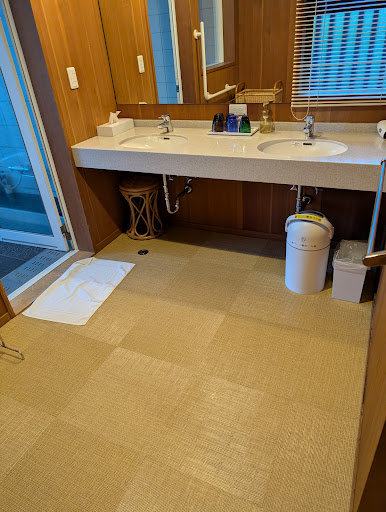 今回は本館和室を予約、8畳+6畳+バストイレ+バルコニーで2人で使うにはなかなかな広さ。 コロナ対策ということで布団は自分で敷くスタイルです。 晴れてれば目の前に富士山がそびえるのですが。。。あいにくの雨天…こればかりは仕方なし。 お風呂は本館併設のお風呂等がありまして、うち風呂&露天風呂で結構広いです。 (コロナでサウナ使えずでした。。。いやはや)