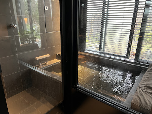 Public onset is very clean with a small locker room with a view of the forest/mountain - since each room has a private onset I only visited the public one once. The private room onset was big enough for 2 people. The hot water is continuously flowing within the onset itself and there is a dial to turn on extra cold water if needed - I thought this was a good addition to help regular the temperature a bit more. While it's in the shower room, the windows can open up which was great to also feel the cold winter air while sitting in the onsen.