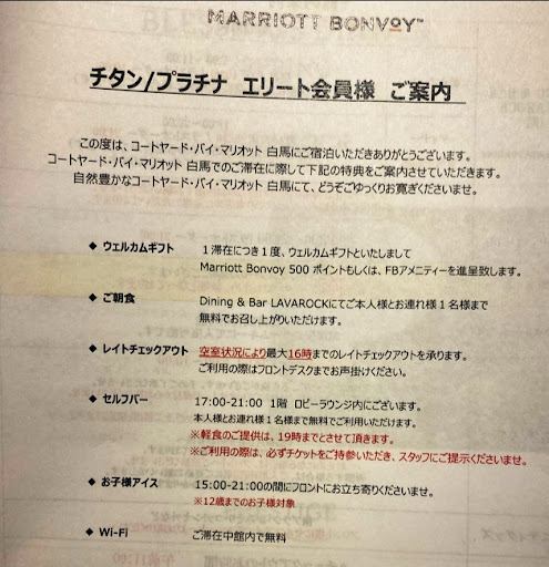 Read moreStayed in this hotel for 2 days as Bonvoy platinum. Here is the update for the Marriott Bonvoy platinum and above level benefit from this hotel. Apparently improved experience comparing to the other reviewersâ. I got room upgrade to onsen room, welcome gift of drink or pints AND complimentary breakfast, and lounge access with food but not just snacks - worth noting that light food will only be served before 7pm. In general I have no complaint any benefit and I will personally consider breakfast quality in Hakuba Courtyard much better than any other Courtyard hotels in town.