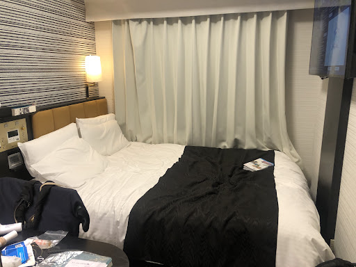 The bed itself is way too small, be prepared for a night of very little sleep. We were constantly in each others way, a nd the curtains hang on the bedding so I was half tangled in the curtains half the time which I found gross. Unlike the matresses of other hotels we've been staying in in Japan, this one was rather soft which meant I was constantly rolling towards my boyfriend. First night in Japan where I woke up with backpain.