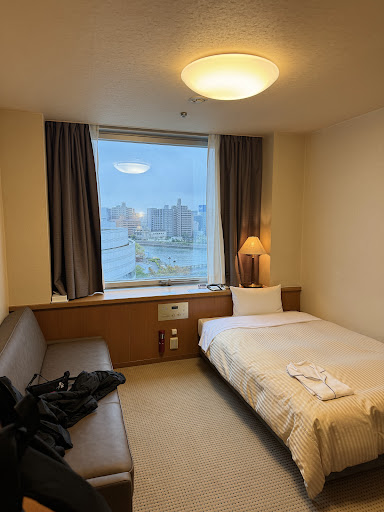 We stayed four nights at this hotel and as we had been traveling around Japan since the end of June, this was one of the best rooms and hotels we've stayed in. Upon arrival, we were promptly checked in, with the desk clerk informing us about the usual rules and regulations before letting us go up to our rooms. ||||The room itself was pretty impressive for the price we paid. I hazard a guess that the low price was due to the hotel and the convention center it was in being in its off-season; but it was well worth the price we paid. The room comfortably fit two with an oversized single bed (they seem to count this as a queen sized or double bed here; but it really only comfortably fits one) and a sofa bed. ||||The bathroom was clean and came with toothbrushes and toothpaste along with mugs to rinse out your mouth with or to house your own toothbrushes. Towels, hand towels and Japanese styled robes were also provided along with body soap, shampoo and conditioner.||||The room had a desk, a fridge, a TV, a hot plate to boil water in a small kettle provided, sachets of two different kinds of tea, 2 tea mugs, 2 glasses and a pitcher of iced water. The closet was probably the poorest piece of furniture in the room - it was shallow, small and only consisted of three hangers; so we had to go back down to the reception to ask for more. ||||There was free Wi-Fi in the room or wired internet via the ethernet cable. The internet via the ethernet cable was fantastic - fast and stable. The Wi-Fi on the other hand was spotty and in certain parts of the room, non-existent. ||||The location of the hotel, as mentioned in the title of this review, is EXCELLENT. It's literally a stone's throw away from the Peace Memorial Park, which is home to the Peace Memorial Museum, the Atomic Bomb Bomb and monuments and cenotaphs dedicated to the atomic bomb victims. All of these are a must see - it's a sobering but very informative experience that will leave you feeling humbled. ||||The hotel is also surrounded by convenience stores - 7-11 and Lawson Station. If you exit the hotel, turn right and walk down, there's a post office. If you exit the hotel, turn right, walk down, then turn left and cross the road before continuing on, you'll come to a bridge across one of the delta streams. Cross that, turn right and walk towards the next bridge, then turn left again and walk to the end of the main road. There, at the corner is a supermarket and Daiso is just behind it in one of those tunnel-like shopping arcades that we seem to find a lot of in Japan. ||||To get to the hotel, you can either a) take the local bus number 24, which stops right outside the hotel; or b) you can take one of the red sightseeing loop buses that run from Hiroshima Station. It's 200yen for a ticket or free if you hold a Japan Rail Pass, which is what we had so we just hopped on and off at will.||||The hotel also has a coin-operated laundry in the basement. It's 200yen for a wash and 100 yen for drying. The dryer wasn't great. Two rounds with t-shirts, shorts, jeans and undergarments and everything was still damp; but as we didn't stay for that long, we didn't bother finding a laundromat in the area.||||Overall, I would recommend this hotel for the convenience of its location and the cleanliness of the room. The Wi-Fi could definitely use some work, especially if you're only lugging around a tablet or phone; because then the ethernet cable would be useless; but other than that, we enjoyed...