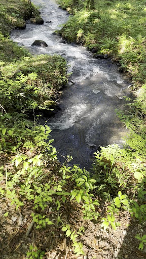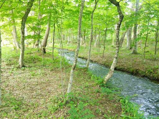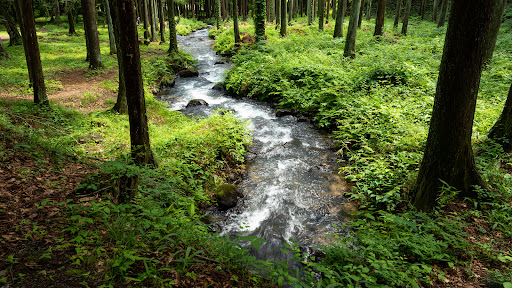 林の中を清流が流れていく景色が心に響く場所でした。日射しが射し込む林と小川がとても綺麗で安らげる場所です。