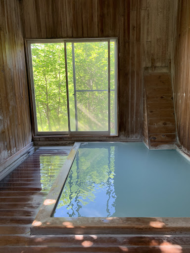 露天風呂でもなく、3人も入るといっぱいになる小さな古いヒノキの湯船ですが、大きな窓から森の木々が見え、天窓から明るい陽射しも入り、本当に気持ち良いです。 風や雨の日も快適に入れます。