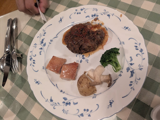 評判の食事はとても美味しかった!鮭のホイル焼き、和牛ハンバーグなどなど、お米も美味しく大満足。 朝御飯は自家製パンやフルーツなちどこちらもとても美味しかった。