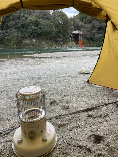 テントが張れる場所は、トイレから5分ほど離れた場所で、地面は河原と同じ小石の砂利。クルマでそこまで進むことができます。