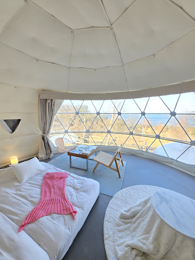 ドームテントは白色で外観も内観もめちゃくちゃ可愛い😳✨ 広い窓からは時間の流れとともに色んな海の表情が見られて特別な時間になったよ☺ (全室から海が見えるわけではないので注意) 照明が可愛かったり、アメニティがL'OCCITANEだったり女の子が嬉しいポイントも盛りだくさん💕