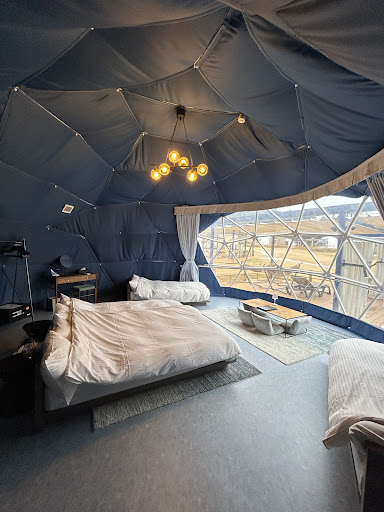 残念な点 ●犬を歩かせて良い場所はごく一部だけ。禁止エリアは抱っこかバッグ。勘違いしてしまうのでHPに記載した方が良い。 ●ベッドの上は犬禁止。 ●トイレシートが少なかった。2匹いたのでもう少し枚数があれば良かった。 ●テント内に排泄用フタ付きゴミ箱がない。排泄のニオイが充満するのであった方がいい。屋外に1つある。 ●犬用の水飲み皿が酷く錆びていた。ありえない。 ●チェックインの男性スタッフが説明不足。一番重要なペット同伴の説明もなくあっさり終わった。混合ワクチンと狂犬病予防接種の証明書を持参したが確認すらされなかった。HPにはご持参ください、チェックイン時に確認しますと記載されてる。以前SNSで犬禁止エリアを歩かせてる動画を見たので最低限説明したほうが良い。説明しないなら同意書や利用案内を印刷して渡したほうが良い。 ●夕食のベーシックコースはクオリティが低く量が少なかった。オプションで追加させようとしてる?肉と野菜はもう少し欲しかった。 ●食事スペースはビニールカーテンで囲ってあるが暖房器具がないので寒かった。別のグランピング施設はヒーターがあったので置いたほうが良い。 ●ガラスドームに宿泊している人達のマナーが悪く、夜21時半〜23時半まで食事スペースでどんちゃん騒ぎ、うるさくて寝れなかった。 ●アメニティを選べるのは嬉しいが、個人的には大浴場にクレンジングや化粧水乳液など揃っていたほうが便利だった。 ●大浴場の中に時計はない。脱衣所にはある。 ●キャリーカートの貸し出しはフロントで声掛けだが、ロビーにご自由にどうぞと置いてあったほうが楽。