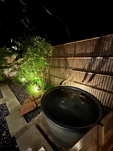 ・露天風呂 信楽焼のこじんまりした1人用浴槽で、内風呂から外を回りこんで行く。割と落ち着くが、足元が改善の余地があると思う。