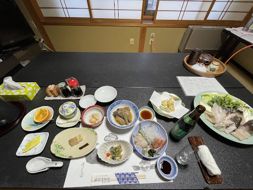 ばばちゃんフルコースと朝食付きの一泊プラン(税込み11,700円)でお世話になりました。 ばばちゃんとは、タナカゲンゲという学名の深海魚で、岩美の特産物の一つです。 白身がぷりぷりした食感で、フルコースはメインの鍋をはじめ、甘煮つけ、刺身、身の唐揚げ、皮の唐揚げ、餡かけ…どれも美味しかったです。