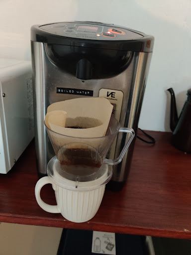 The kitchen especially is great. There is a large shared fridge and freezer, microwave, toaster, hot water dispenser, stovetop, spices and oil, salt and sugar, pots and pans, cooking utensils, etc.. There is free filter coffee. Unfortunately there is no supermarket close by, at least on foot, so if you want to cook you should grab groceries near Shuzenji Station, or from the konbini about a 15-minute walk away.