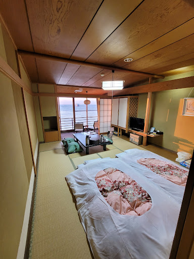 We stayed here for Christmas Eve and Christmas Day. The location is fantastic with wonderful views over Suruga Bay and a small beach in front of the hotel. I was checked in in English - a first experience for Japan. The room was large and comfortable with great Wi-Fi. The dinner was amazing - and we enjoyed the eat-as-much-as-you-like ice-cream for dessert. The staff were helpful and friendly throughout. While we had dinner, our futons were put out for us. The hot spring was great - one downside - I wish they offered all customers a free blocking for private time onsen during their stay - I asked about it but was told it would be an additional cost for 45-minutes. The location of the hotel was superb. On Christmas Day, we took a long walk along the coast road and enjoyed the breathtaking views of the bay. In the evening, I could also get some supplies from the 7-11 next door. There's a fridge in the room, so very convenient. Getting there and getting back was very straight forward as there is a bus-stop right outside the hotel - On the 26th, we took the 10.22 bus back to Mishima. Definitely worth a stay at this hotel. We hope to be back one day...