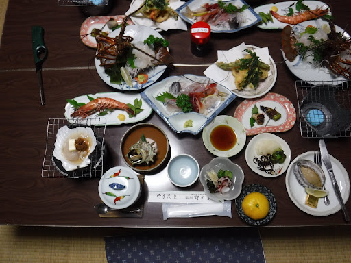 Read more多くの宿泊施設がある土肥温泉の中の1つで、目の前が漁協で海が眼前に広がります。|(おそらく天気が良ければほぼ正面に陽が沈むと思います)|幸いにも宿泊客は私達だけでしたので、オーシャンビューの部屋でした。|お風呂は湧出すお湯は少ないながらも源泉掛け流しで、無味無臭のサラリとしたいい泉質の温泉で、洗い場2箇所、浴槽は大人なら3名程度が入れる大きさと言ったところです。|料理も魚を中心に種類も多く、どの料理も美味しいです。|温泉は24時間好きな時に入れますし、2食付きで税込1万円を切る価格なので、満足出来ると思います。|古いですが、清掃は行き届いており清潔感はありますが、古さゆえに綺麗とは言えませんので、若いカップルなどで綺麗さを求める方には不向きかもしれません。|今回は私達夫婦の1組だけなので特に不満はありませんが、洗面所の水道は1つでトイレも1つ(奥にもいくつか部屋があるため、奥にも使用できるところはあるかもしれませんが…)|お風呂も1組の利用が前提かと思いますので、複数組での宿泊には不便さがあるかもしれません。|トイレがウォシュレットじゃなかったのもちょっと残念ではありましたが、トータルで見れ...