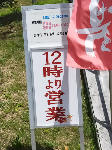 三原東城線(25号線)を三原方面から来ると手前にそば処門花亭あり。